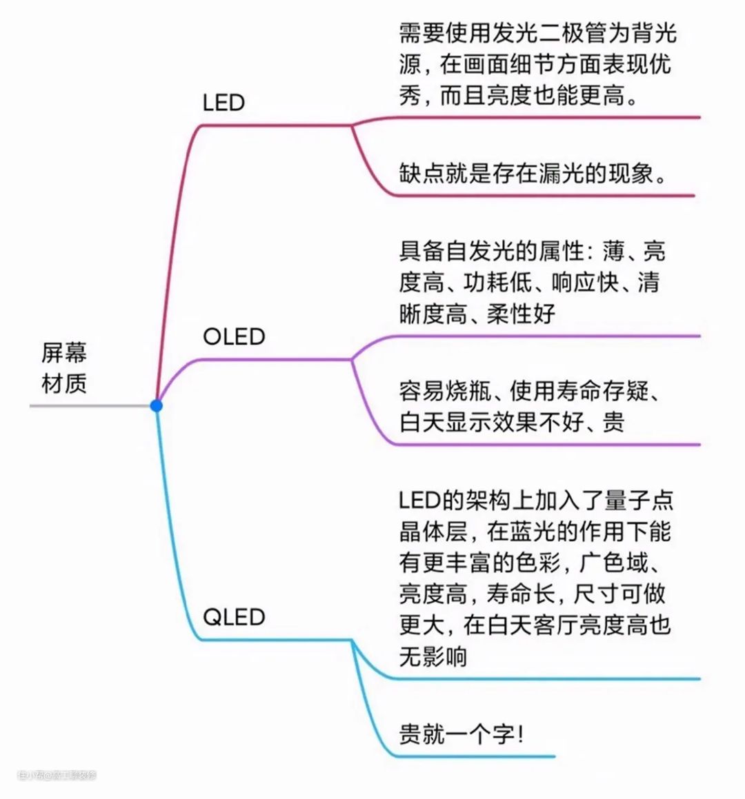 目前主流屏幕材质就是LED、OLED、QLED三种,有人会说海信有一款独门的绝技叫ULED,其实这里所指的是LED的加强版。