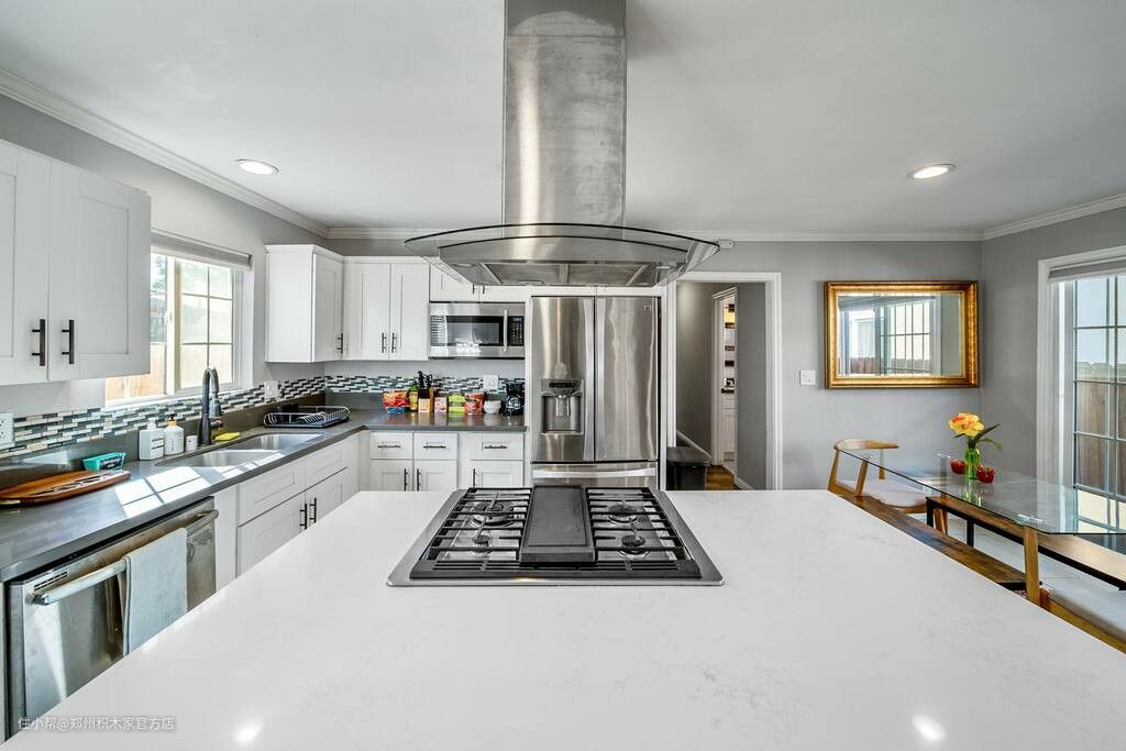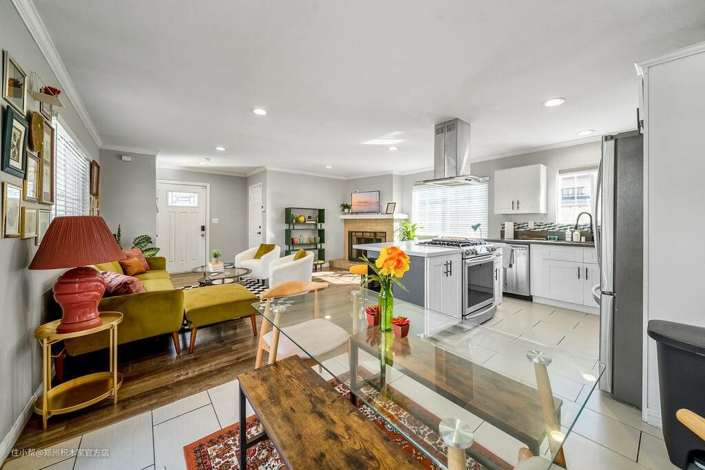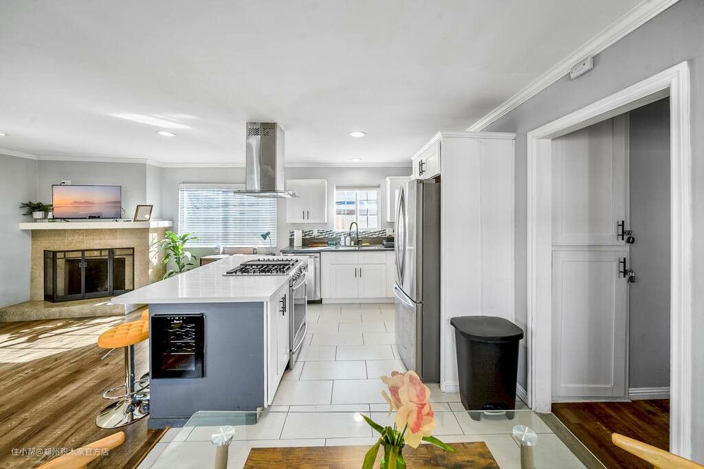 打破原有格局,将原本的围墙拆除,设计成开放式结构,同时与餐厅无障碍互动,能提高互动的乐趣。橱柜门选择了白色的木饰面板,搭配黑色拉手,显得精致有序。在厨房的一侧,将冰箱完美嵌入了橱柜之中,收纳非常充足。