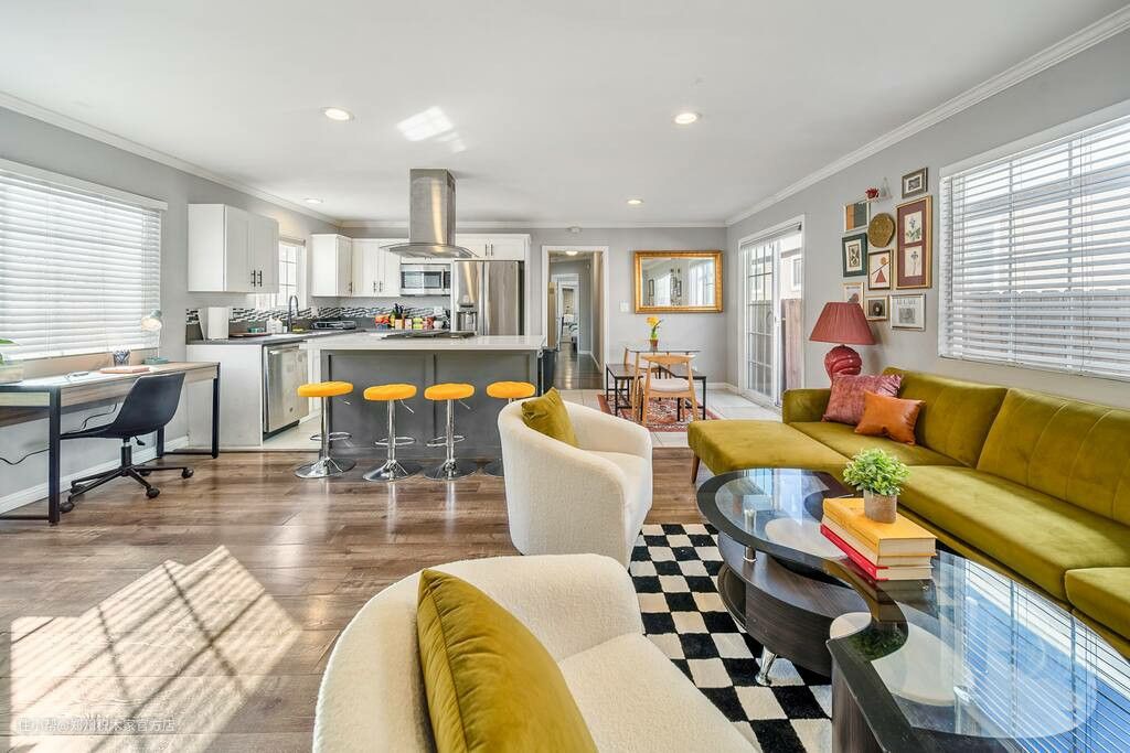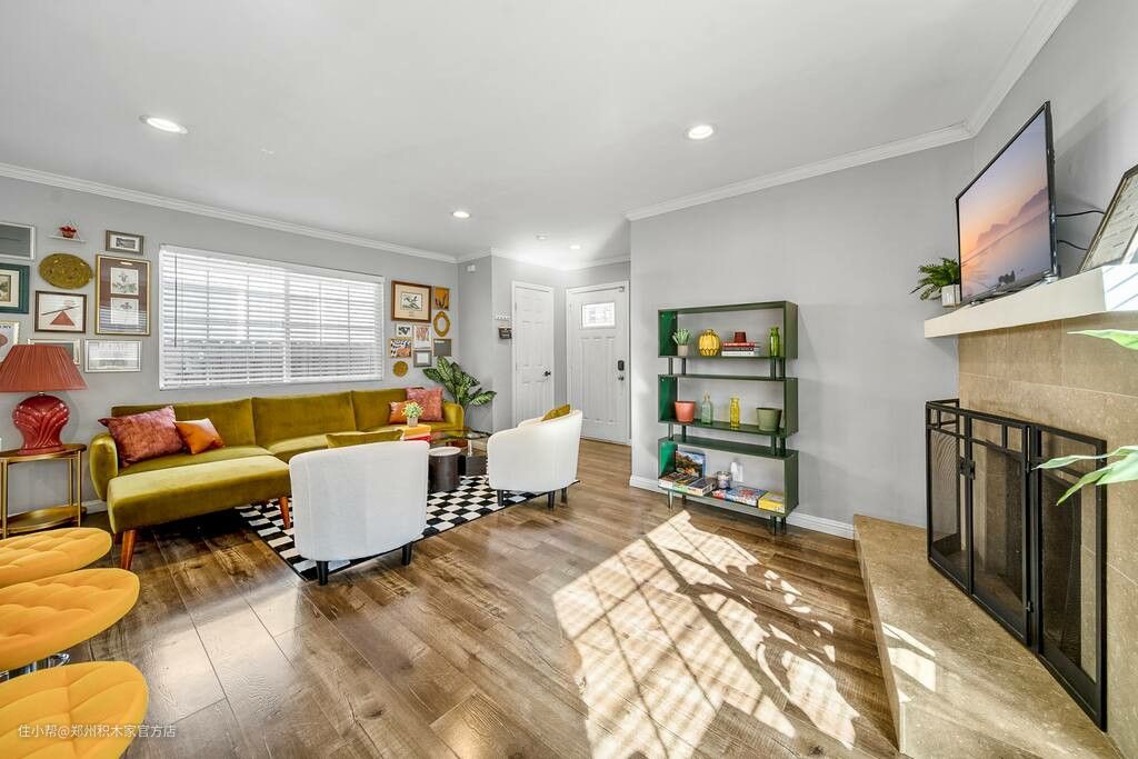 在客厅中,整体的改动还是比较大的,为了满足业主对空间透畅性要求,拆了厨房部分非承重的墙体,整体扩大了空间使用面积,更显得通透。把客厅和厨房打通,通过优化墙体调整空间,视野宽阔很多。全屋采用了冷寂的灰色调,搭配上棕木色的地板,以及一些黄色系列的沙发点缀,让冷寂的空间多出一份温度。