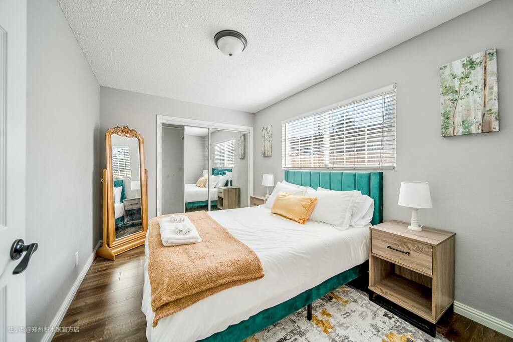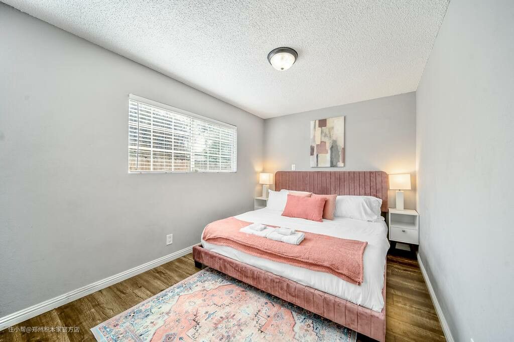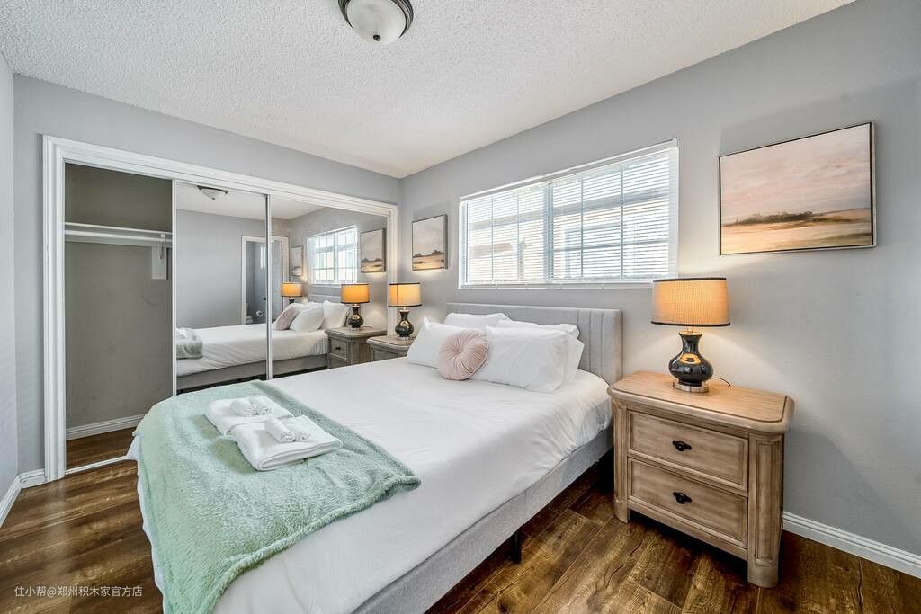 在各个卧室中,高度匹配还原了客厅的主题,灰色空间+棕木色地板搭配,整体协调统一。百叶窗组合简单实用,在灰色空间中轻便协调。而卧室的软装搭配上,则是采用了部分醒目的配色,绿色或粉色的床为主,黄色与粉色搭配。