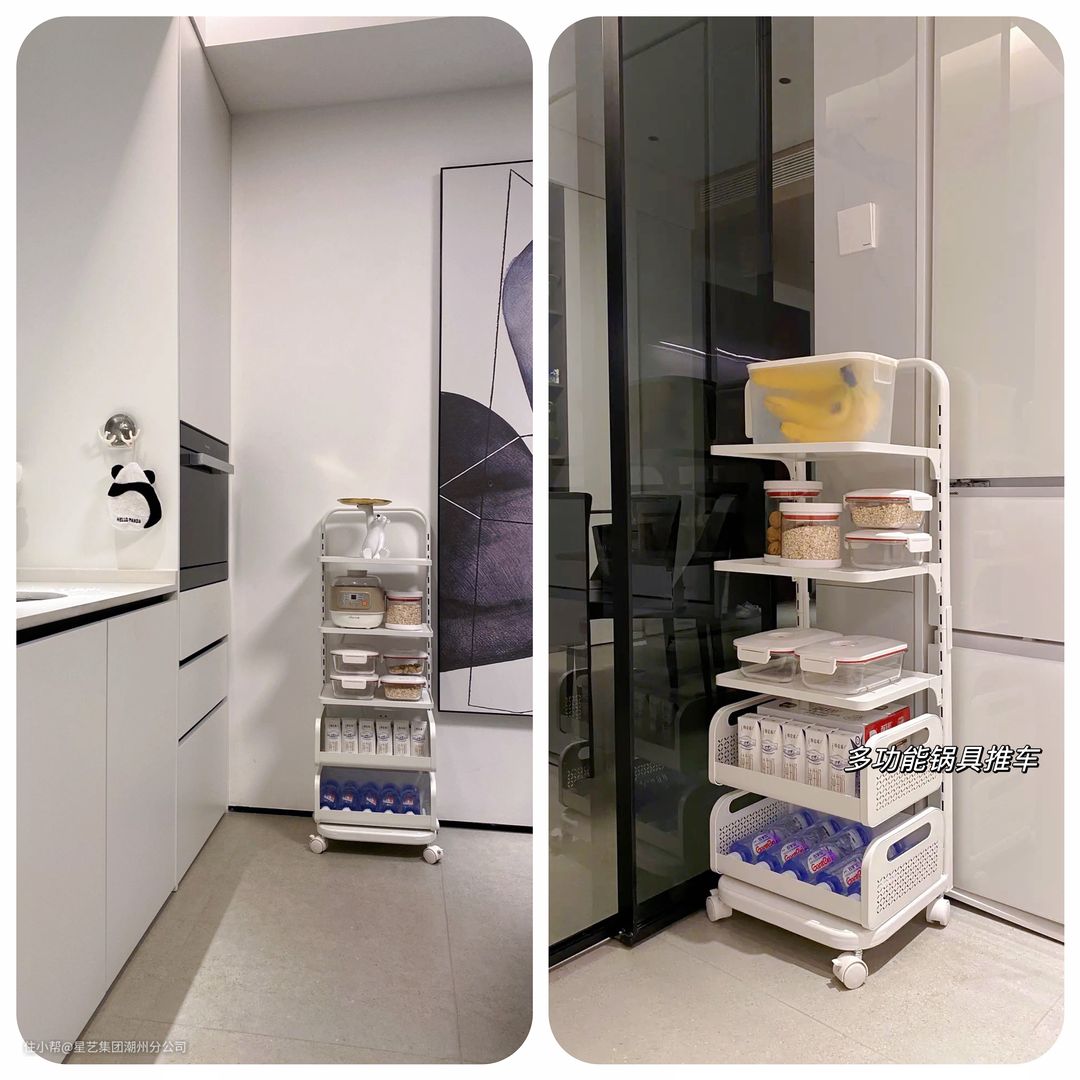 🔸上面几层放锅和收纳盒,下面囤饮料或者蔬菜瓜果🥒每层都可以调节高度,卡的也很稳固,承重很可💫