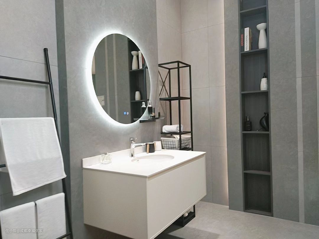 整体色调为灰色,墙面和地面都是哑光材质,比亮面瓷要防滑一些,置物架和格子都设计的比较高挑,避免让老人频繁弯腰,镜子后面有一圈灯带也起到了辅助照明的作用。