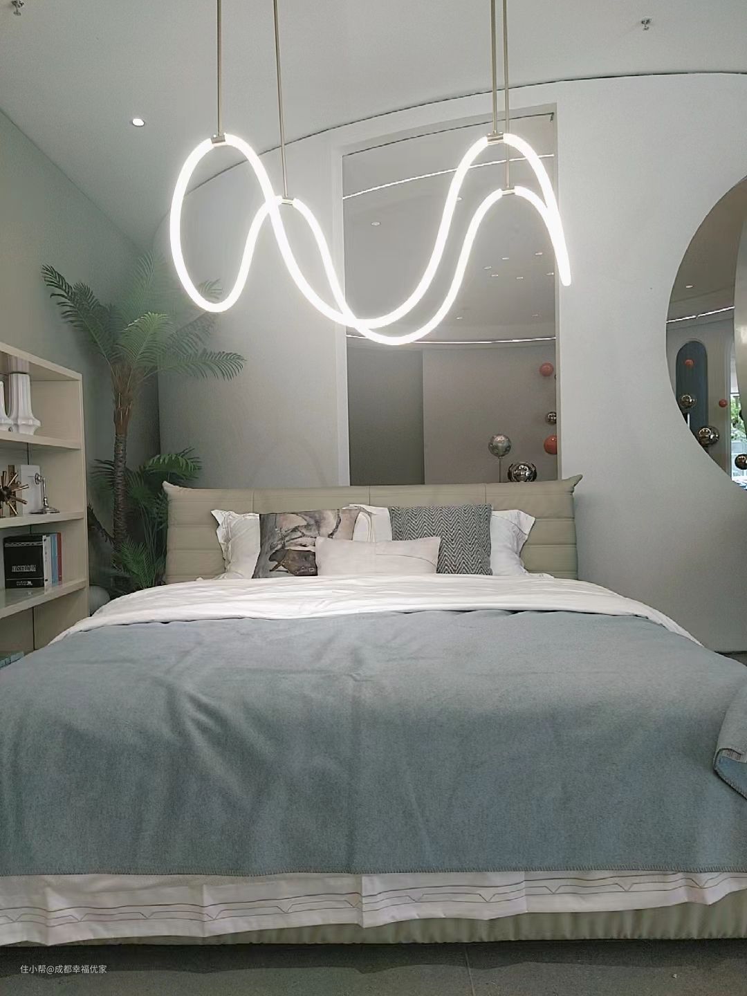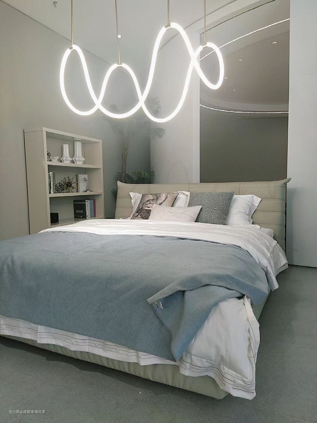 床头软包阻挡了一部分视线保证隐私,也有一定的隔音效果,吊灯造型奇特、灯光不刺眼,浅灰色床套颜色朴实沉稳不沉闷,是一个内敛包容的颜色。