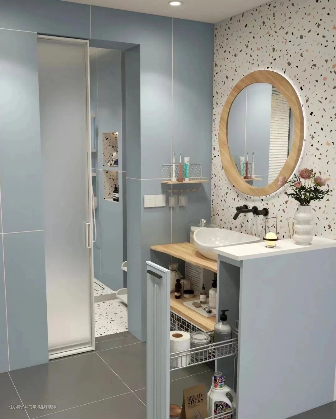 即便是洗漱台外移了,洗漱区的墙面还是建议贴瓷砖,毕竟相比其他材料,瓷砖的防水能力最好,有水渍污渍也好打理。