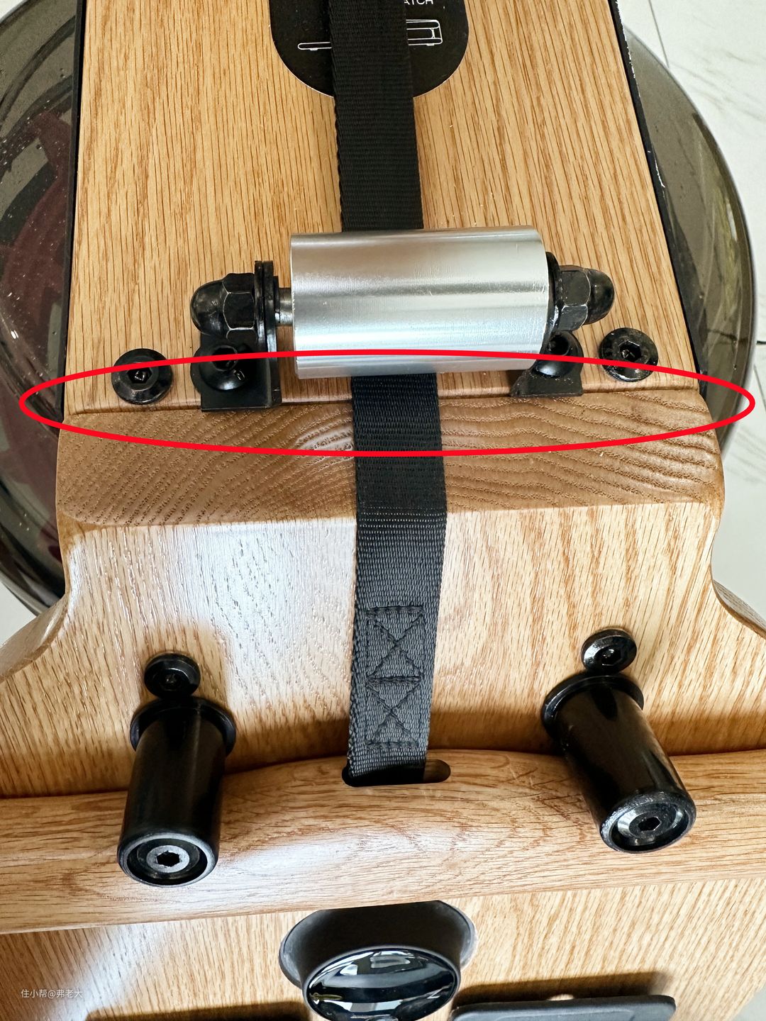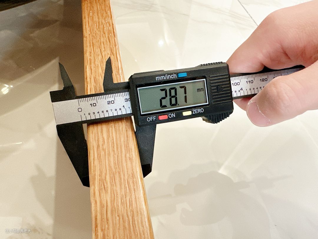 身为工科男,楼主就喜欢用仪器测试比划。用游标卡尺实测,划船机的主框架厚度是28.7mm。厚实的红橡木尽显扎实用料,