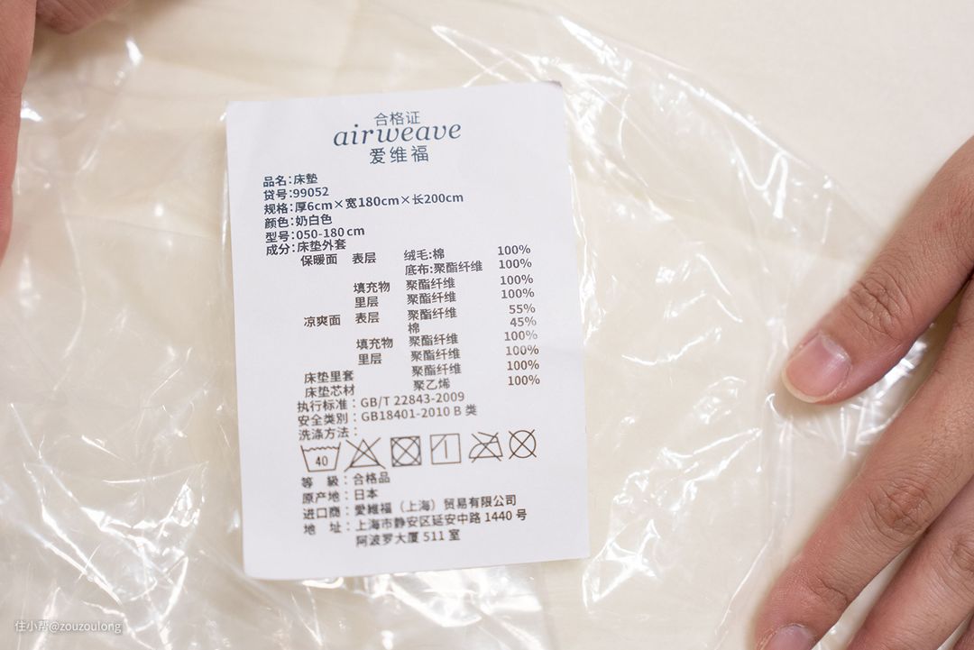 来看看爱维福050薄垫的用料诚意。可以看出,外套、里套和填充的3D空气纤维芯材airfiber结构可分离,这样配置的好处是,外套、里套可以丢洗衣机里洗,杀菌除螨和烘干都没问题,而芯材则可以直接用40℃以下的水冲洗。