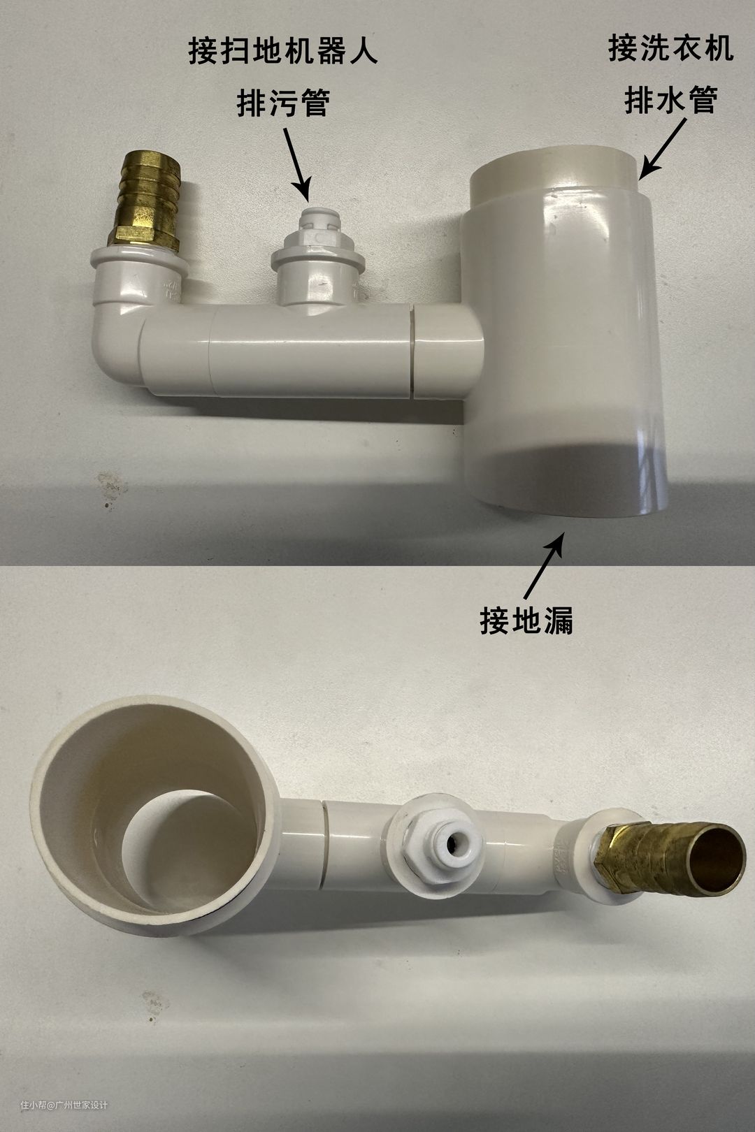 建议自行购买多合一排水管(如图)接地漏,可同时支持洗手池、扫地机器人和洗衣机等多个设备下水,有效防止反水、反臭。