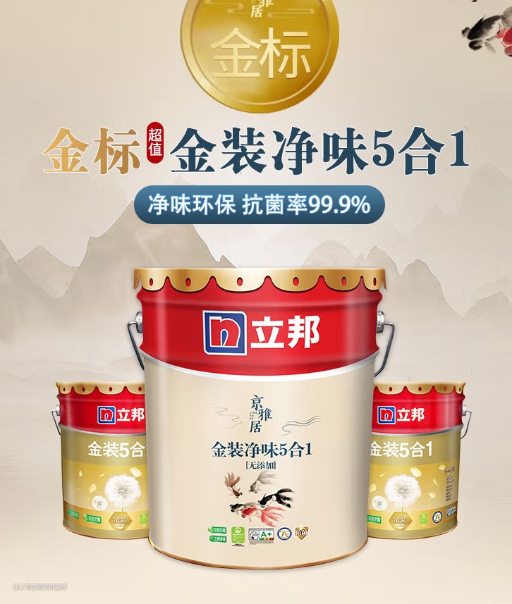 除了儿童房以及阳台,挨着卫生间墙面和一些潮湿地区这些特殊区域以外,有没有综合能力强,适合大面积滚刷的乳胶漆呢?那我会推荐你选用京雅居金装净味五合一。为什么会推荐这款,因为它将耐擦洗,环保,防霉,抗碱和抗菌这五项性能融合在一起了。有的人家里喷完漆,那刺鼻的味道真的受不了,作为立邦漆的当家花旦,净味是它一大特色,给我最直观的感受就是,我走进刚刷完漆没多久的房子,除了它本身漆的味道以外,还真没有闻到特别让人难受的气味。