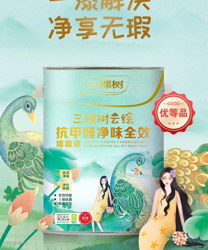 如果你也曾遇到家里阳台吊顶,挨着卫生间的墙面,或者一些会潮湿的地方出现起皮,发黑发霉的情况,为了避免新装修的房子再次出现这种情况,那我推荐你选用三棵树漆云绘抗甲醛净味全效墙面漆。这款是0级防霉的,这已经是目前最高的防霉等级,像阳台啊,地下室以及会有水汽的环境下,都可以用这款,适用范围还是很广的,同时还获得了美国绿色卫士认证,中国绿色十环认证以及法国A+级标准认证,在环保性上也有一定的保障。