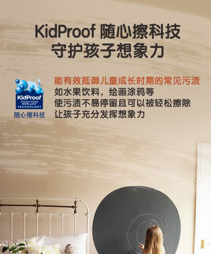 像一些小朋友很有绘画天赋,经常在墙面上绘画涂鸦。一般的漆还真不好擦洗,而多乐士这款漆有KidProof随心擦科技,像一些常见的污渍,涂鸦都可以被轻松擦除~