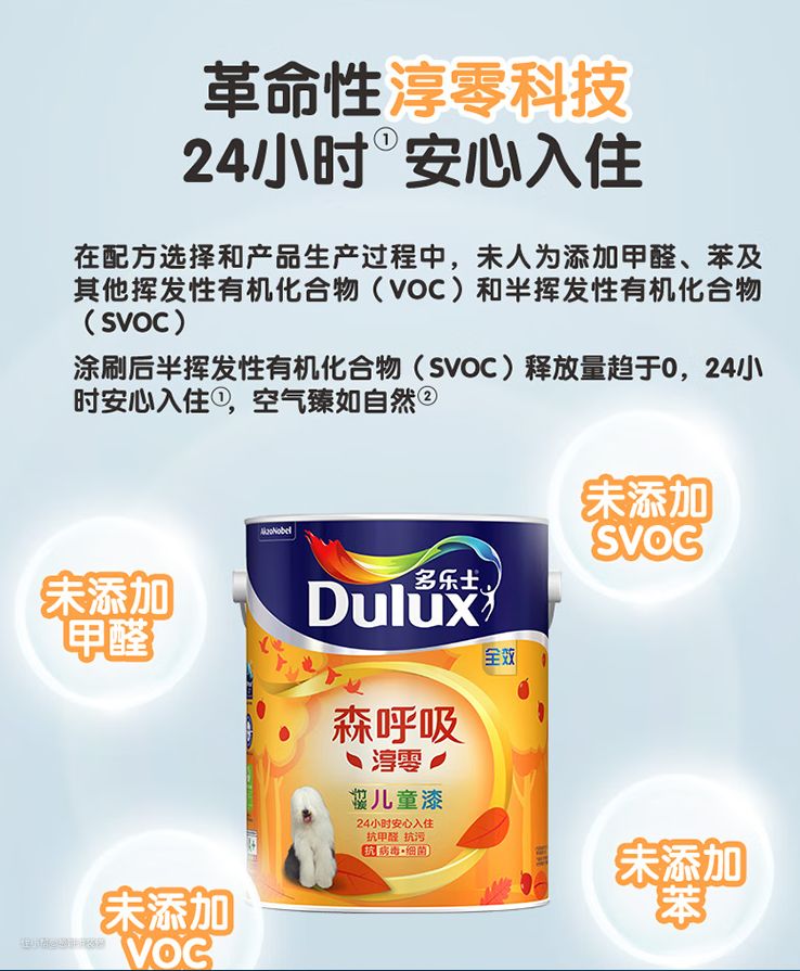我推荐你选用多乐士森呼吸淳零儿童漆。这是多乐士专门针对儿童房设计出的一款产品。它宣传的淳零技术,通俗来说,就是在配方选择和产品生产过程中,未人为添加甲醛,苯以及其他挥发性有机化合物和半挥发性有机化合物(SVOC)。多乐士这款漆添加银离子抗病毒技术,对于金黄色葡萄球菌,大肠杆菌,肺炎克雷伯菌等20种常见治病菌有很强的抵抗力。