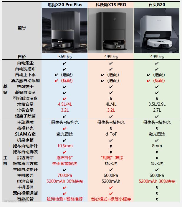 这张图详细展示了追觅旗舰 X20 Pro Plus和科沃斯旗舰 X1S PRO以及石头旗舰 G20之间差别,其中标红部分表示“优胜”。可以非常明显地看到,追觅X20 Pro在硬件性能方面和软件功能全都毫无悬念地完胜另外两款 ▲