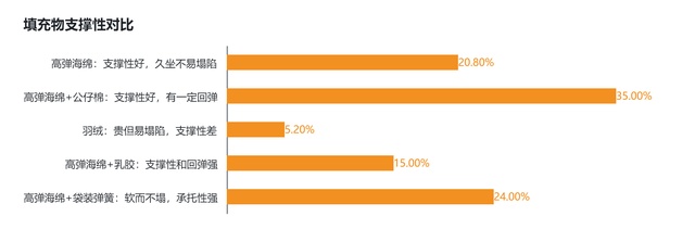 作为直接承托人体重量的材料,内部填充物的支撑性决定了沙发是否塌陷。全羽绒填充的沙发,支撑性差易塌陷;高弹海绵搭配乳胶或袋装弹簧,支撑性和回弹兼具;高弹海绵+公仔棉是市面主流,正常使用5~10年没问题。