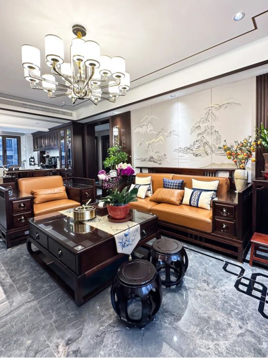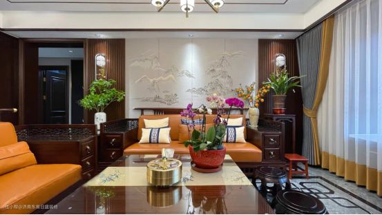 沙发采用橙色皮革制成,结合了中国魅力和现代舒适感,营造出平静的氛围,为空间增添一抹优雅。背景墙以水墨画点缀,辅以茶具、瓷器等陈设,散发着东方手绘的韵味。
