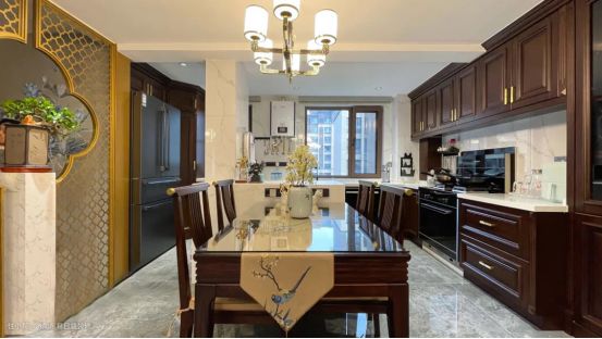 餐厅位于客厅和厨房之间,是标准的大横厅布局。L型厨房实现了洗、切、煮的合理布局,动线流畅,方便厨房操作。红木色的两排柜设计提升了整体厨房空间,让内置的蒸汽烤箱和冰箱更容易取用。