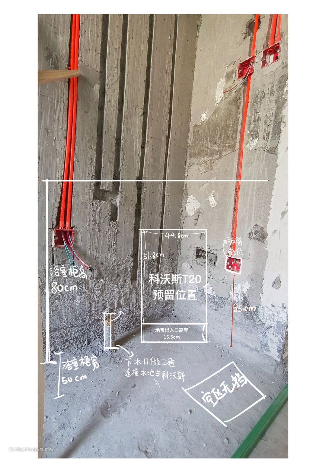 再次,水电预留。对于拥有上下水模块的扫地机器人需要提前确定上模块上下水接口的位置和要求,科沃斯T20 扫地机器人的上下水接口位于机器后方距地35cm的地方,基站高度57.8cm,如果是拥有自动上下水模块的基站可以将上水角阀设计在距地65cm以上的位置或者侧面,有效节省基站背部的空间。如果是手动上水的基站,则需要考虑到基站舱门打开和拿取水箱的空间,切记!否则每次换水都需搬动基站,增加负担。这里给出数据进行参考,水箱高度27cm,手的厚度5cm,加上基站原有57.8cm,建议预留至少距地95cm的空间,相较卫生间或者厨房台面下,脱离了上下水管路的限制,放在家政柜或者公共区域会更为合适。