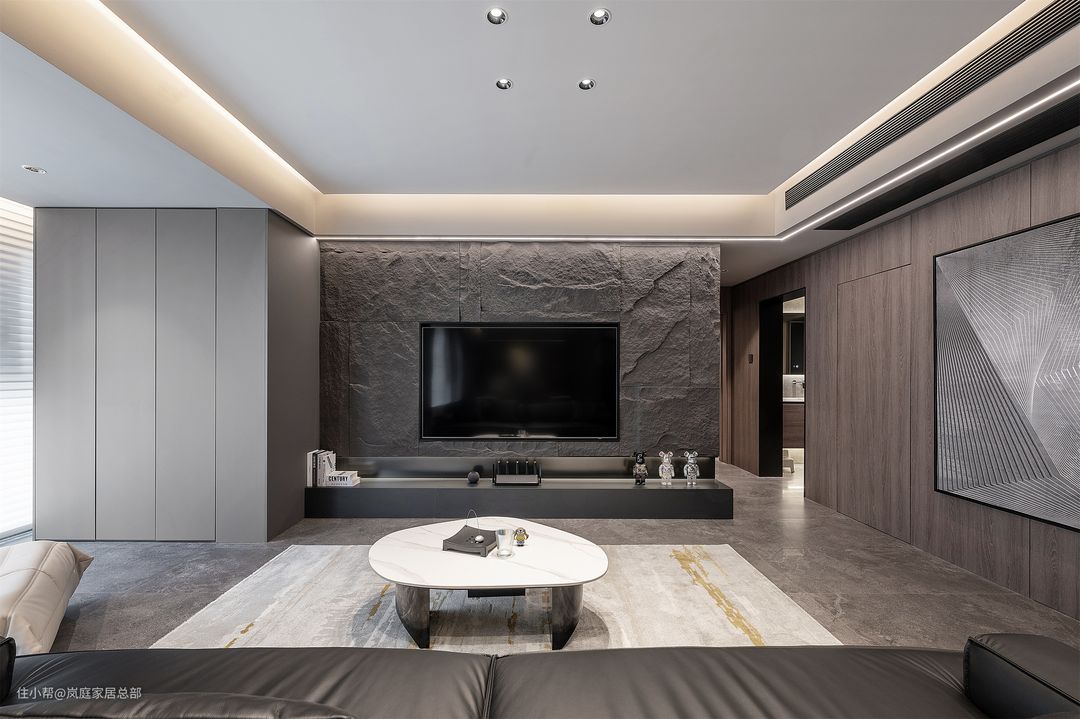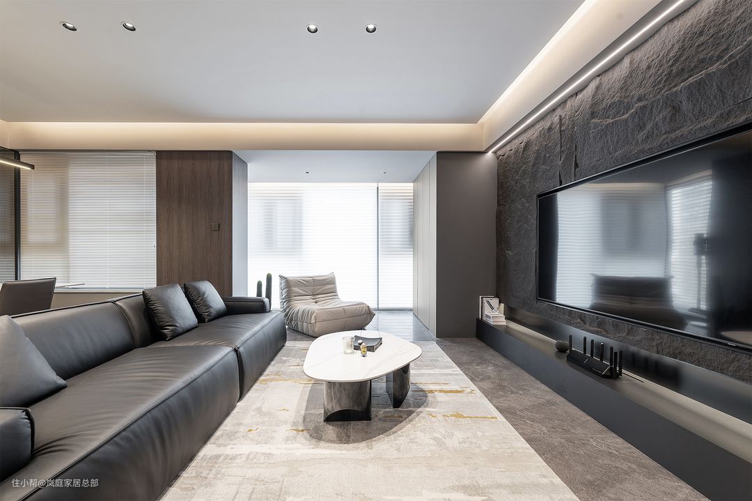 现在暗黑风最具有特色的就是石材元素,这个家的电视背景墙设计师就是选用了天然的蘑菇石上墙,粗粝但极为细腻的视觉及触感,让石材也多了分温和度。