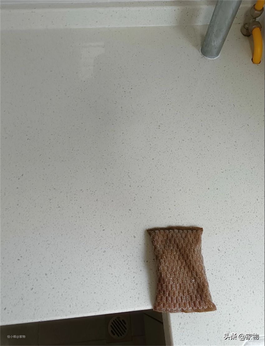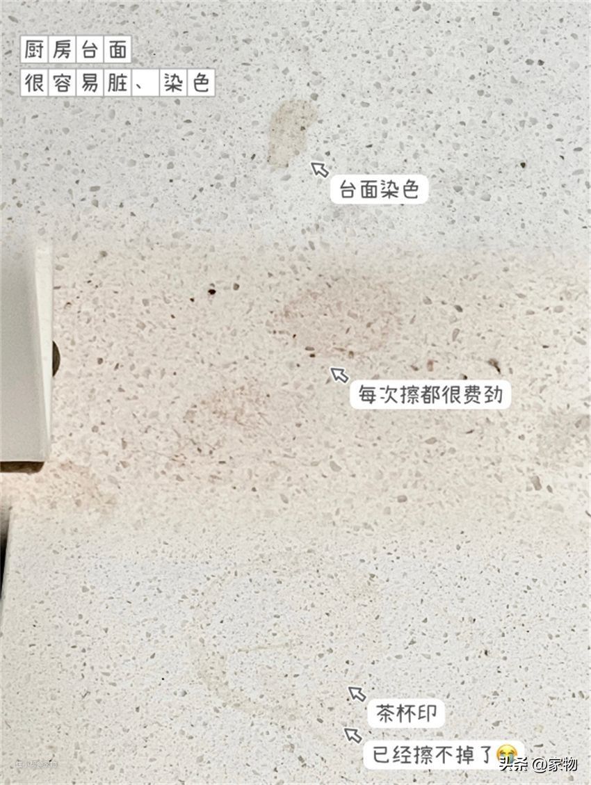厨房是白色石英石台面,尽管它的表面没细孔且不易渗色,但使用时难免会蹭上油污或调味品,若发现不及时形成顽固污垢,发黄后十分难打理,尤其是茶杯印痕,根本擦不掉!