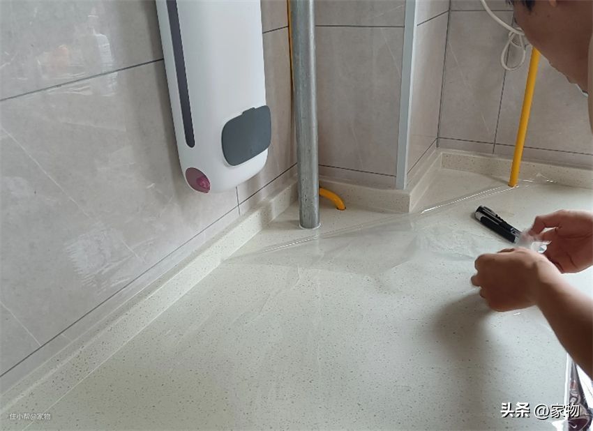 ②台面喷水后贴膜拉紧,记住先喷水,否则膜不服帖;