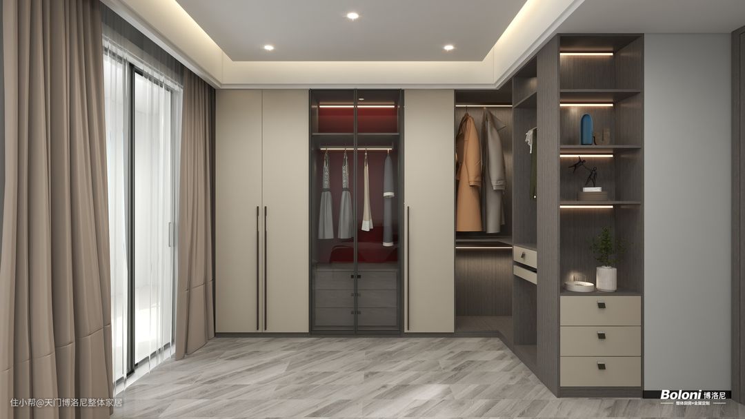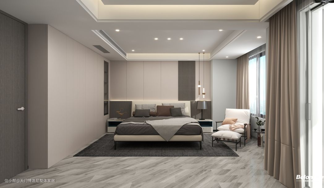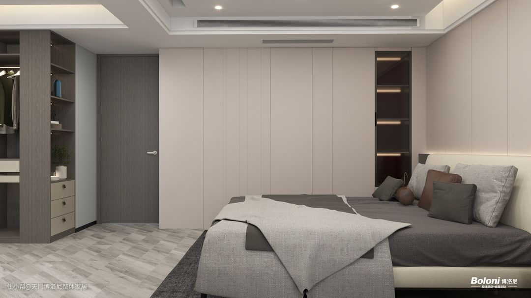 主卧也不需要太过于负责的造型,在进门处打造了L形衣帽间,增加空间的储物性和利用性;一门到顶的衣柜采用和客厅一样的奶油灰板材,耐脏又好打理,不需要特别的养护也能持久如新~再加床头一组简单的吊灯,就足够了。