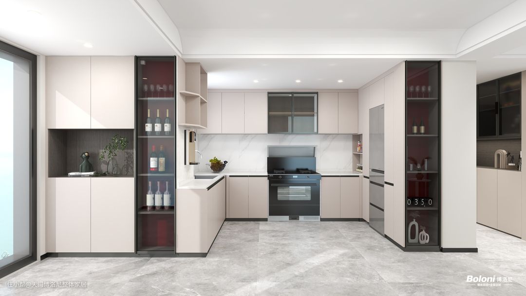 开放式厨房,洗、切、炒、盛的厨房动线,越用越顺手。外侧一面墙做高柜,增加收纳储物面积,同时可以保持台面的干净整洁。