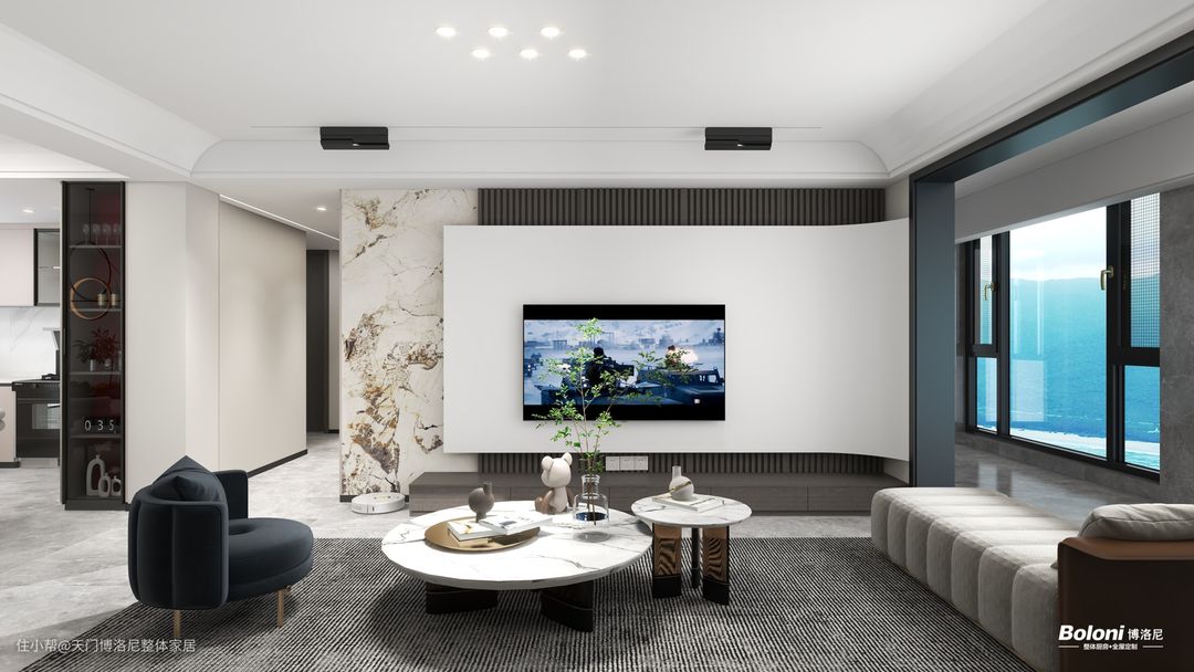 电视背景墙是由木格栅+岩板+落地电视柜搭配,沙发背景墙同样是由木格栅+木饰面+岩板搭配而成,和同色系地砖做呼应,墙浅地深,这样就不会有头重脚轻的感觉,视觉上也更显高。