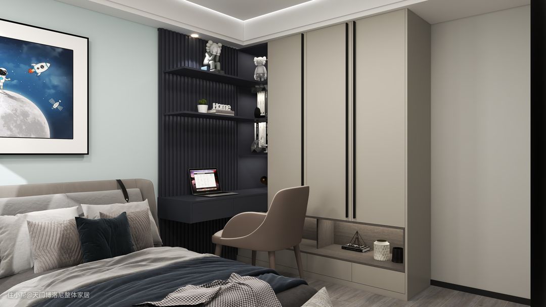次卧是留给小朋友的,主色调为深蓝色+灰色系的搭配,简单耐看,书桌和衣柜连接,便于孩子后期学习生活。