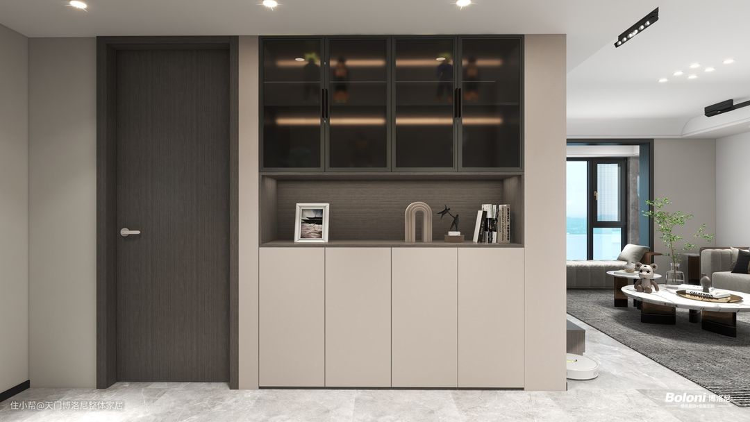 玄关过道柜,在下方预留鞋柜的位置,上面做了玻璃柜+灯带的设计,也能让空间更通透。