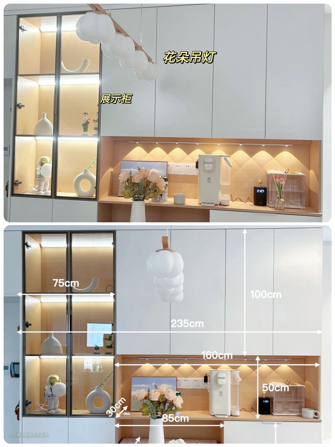 🔺用的是四头棉质吊灯,开着暖光一整条温柔的活,一点都不影响柜门的开启