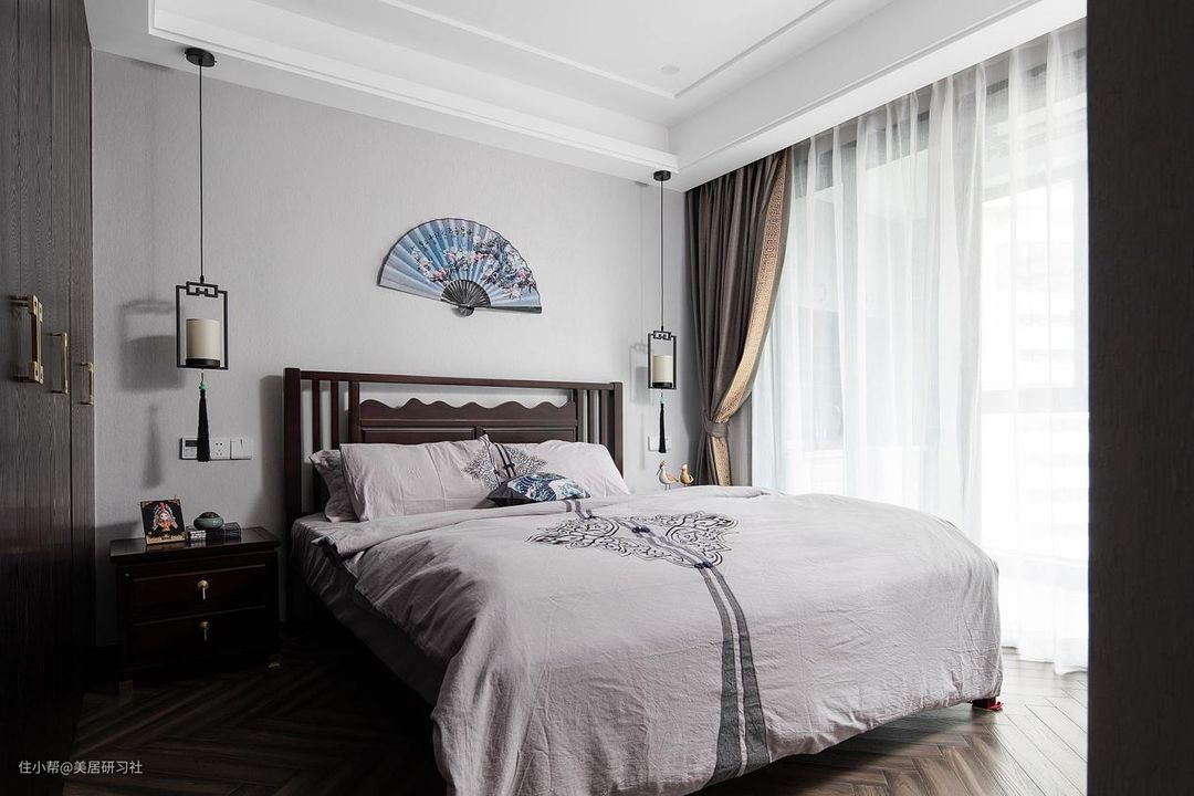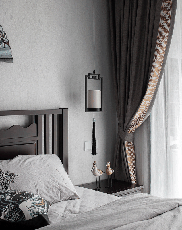 父母房的设计相对比较简单些,床头背景墙也只是简单一幅墙布挂上折扇画,床头两侧一盏中式风格的小吊灯,胡桃木的大床,有中式图案的床品,灰啡色的窗帘布,收边处有一条中式回纹图案,还有衣柜那古铜色的中式拉手等等,使得整体空间非常有格调。