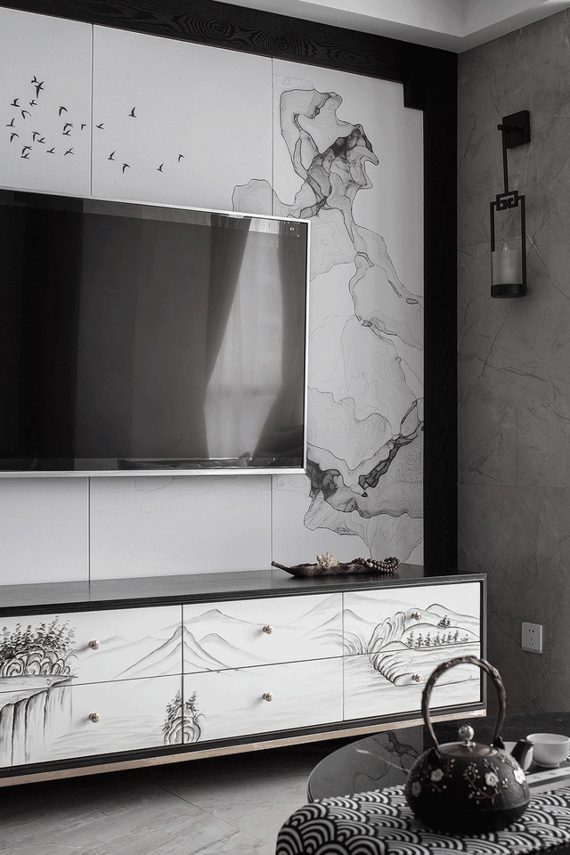 客厅电视墙的山水画与电视柜柜门的山水画相互响应,给人一种很有意境的氛围,着实让人陶醉。