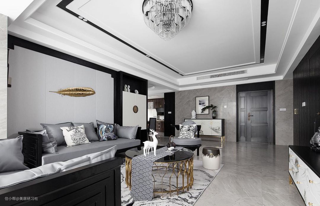 客厅的家具是1+2+3的组合形式,都是统一色调和材质的款式,黑色原木框架搭配灰蓝色皮革坐垫,沙发上摆放具有中式元素的抱枕;中间一张圆形茶几,古铜色的支架配黑色大理石台面,还有一张黑白配的圆凳,摆放在黑白调的山水纹地毯上,整体格调高雅而静谧。