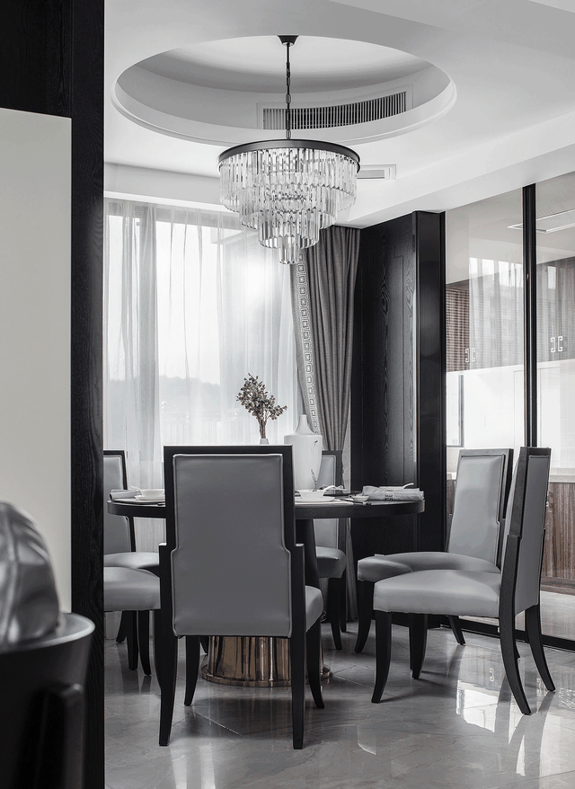 餐厅地面是暖灰调柔光砖,左侧墙面同样是暖灰调柔光砖,右侧是一门到顶的厨房玻璃趟门,门的两侧是黑色木饰面造型墙,天花分了两级造型灯池,外围是方形,内面是圆形,也是对传统文化的“外方内圆”的一种表达方式。