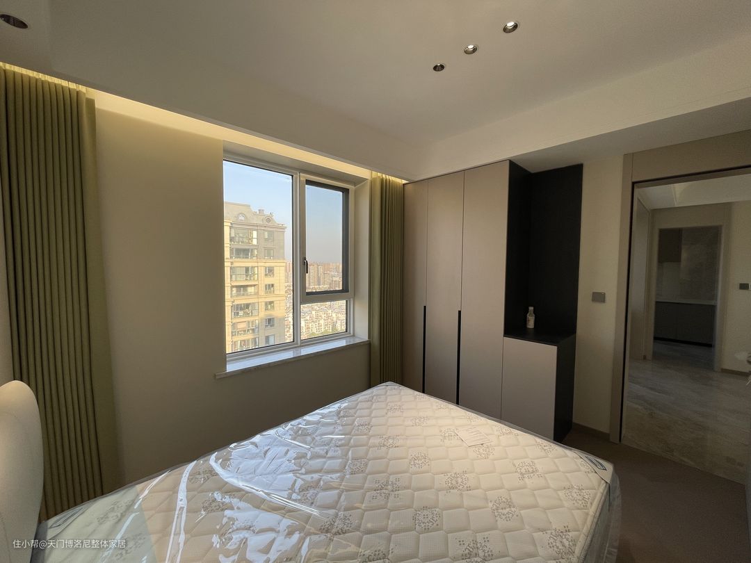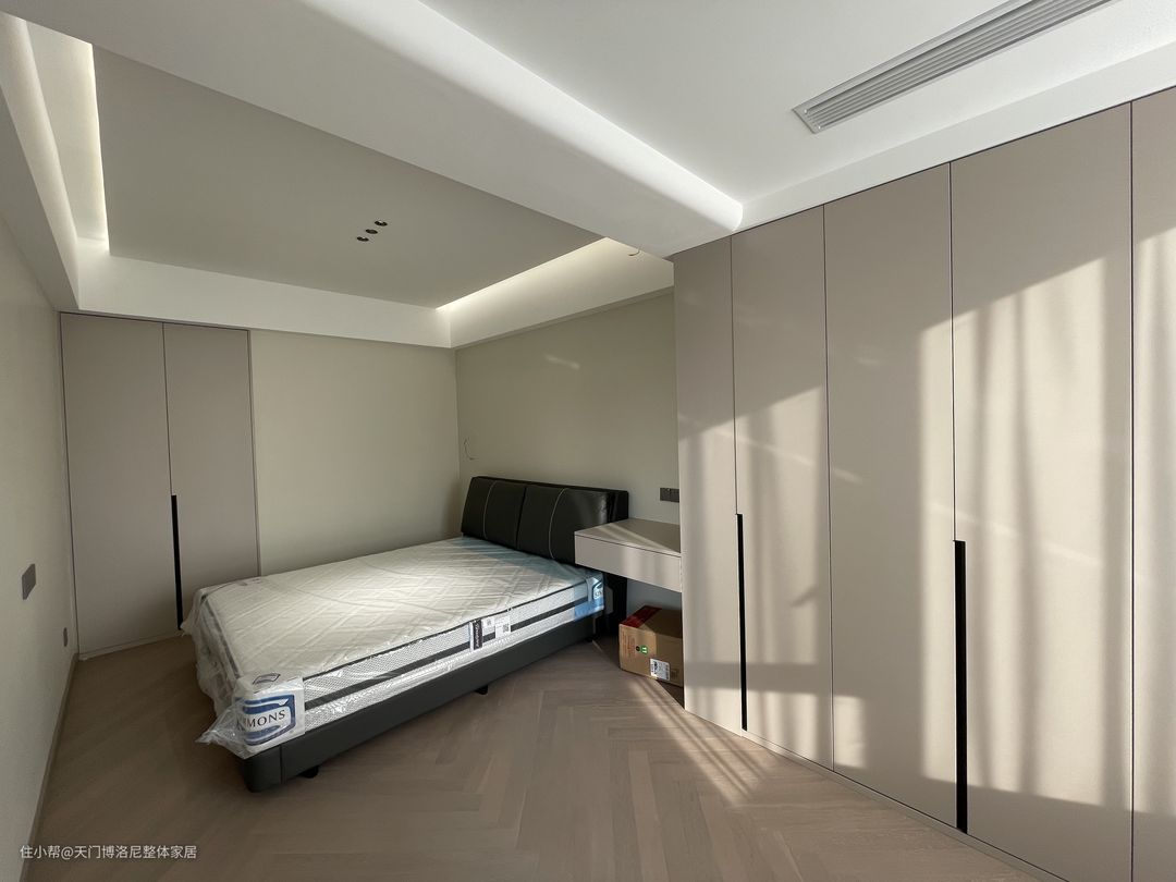 卧室的地板采用人字拼式,空间上有延伸效果,有格调又耐看~一门到顶的衣柜同时兼顾了实用性和美观~