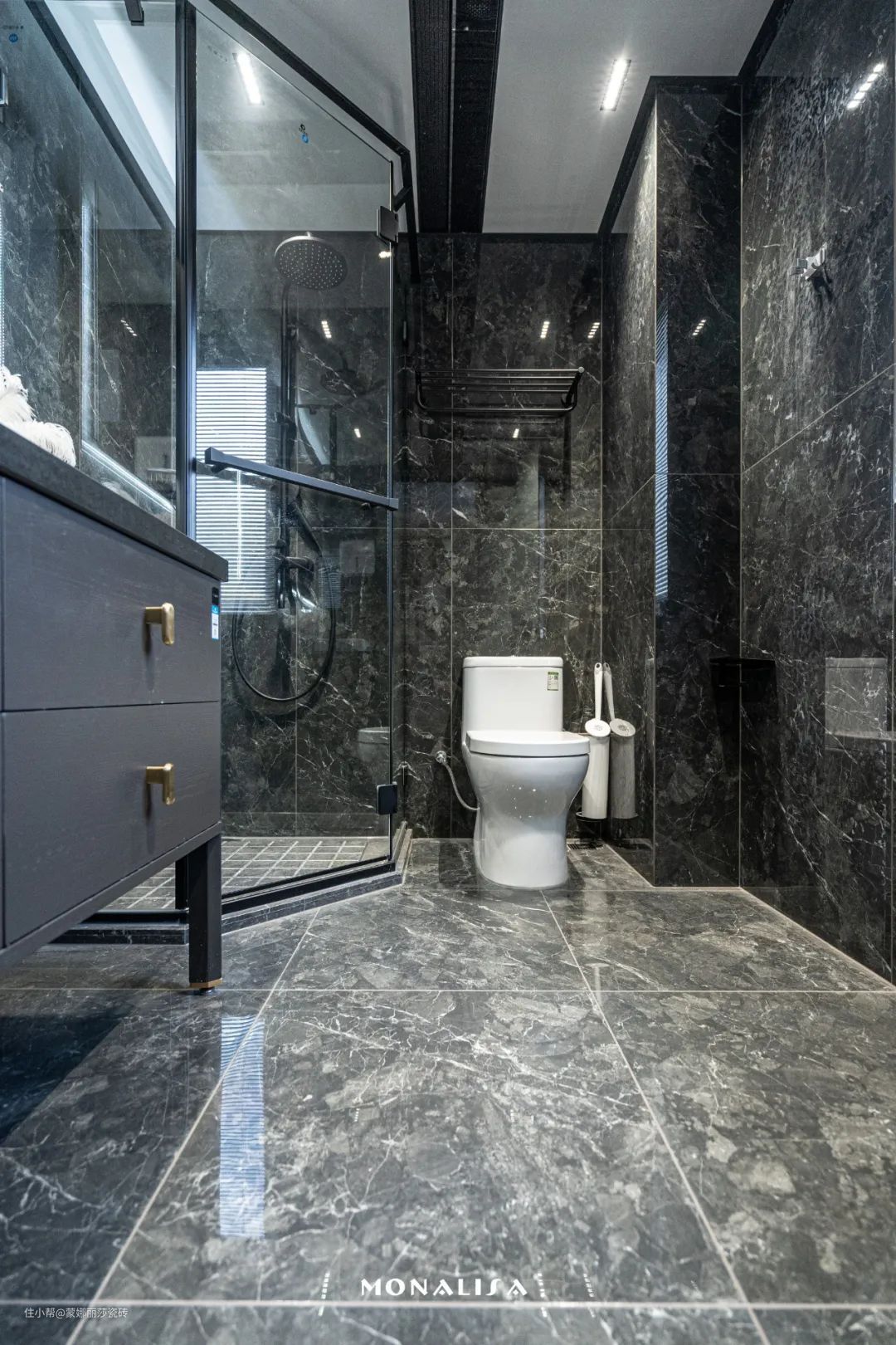 黑白的经典色系在空间各处得到巧妙应用,墙地面均用蒙娜丽莎瓷砖新意大利灰600×1200mm的大砖通铺,亮光面在无主灯的映射下,轻奢又有质感,使得简约的空间更极致美观,卫浴柜采用深灰色与白色的组合搭配黑色边框玻璃淋浴房,不同色系深与浅的交织,充分体现出高贵品质与简约时尚的艺术特质,为空间带来无限的表现力。