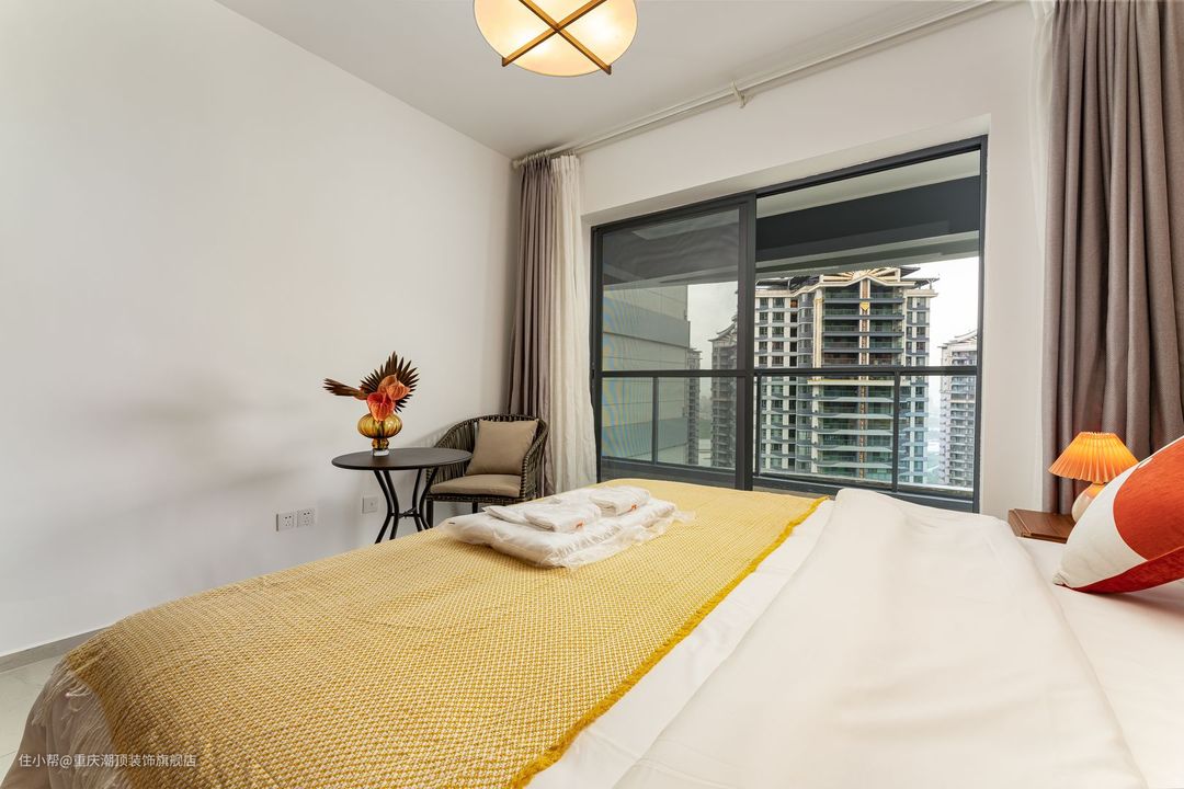 整个房间做暖色系装修风格搭配姜黄色四件套,大大的落地窗,能够让整个房间充分感受阳光,简约吊灯增加房间的光线,搭配深色原木系推拉门衣柜,简约大方