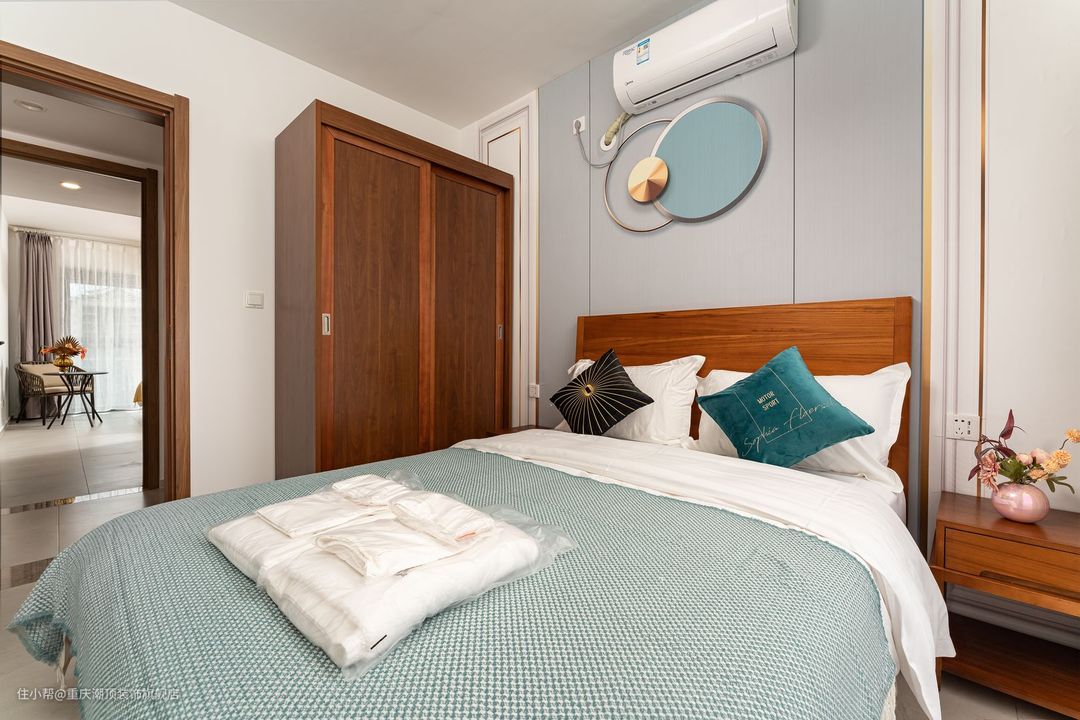次卧相对于来说要简约一些,床头做石膏背景线条设计,同款衣柜设计整体呈现复古高端的感觉,搭配小清新床品,优雅永不过时