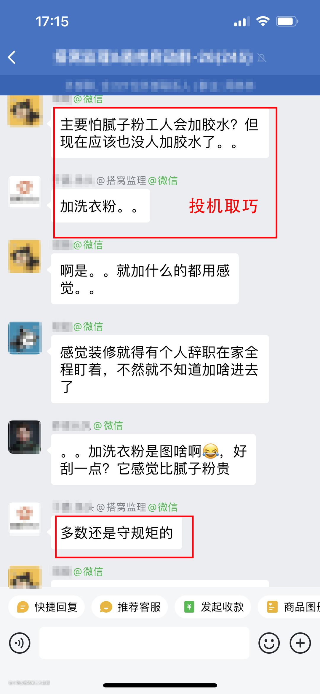 如果在装修的时候发现工人在腻子粉中加胶水、在水泥里加洗衣粉或有其他投机取巧的行为,一定要及时的制止,不然最后业主吃亏。