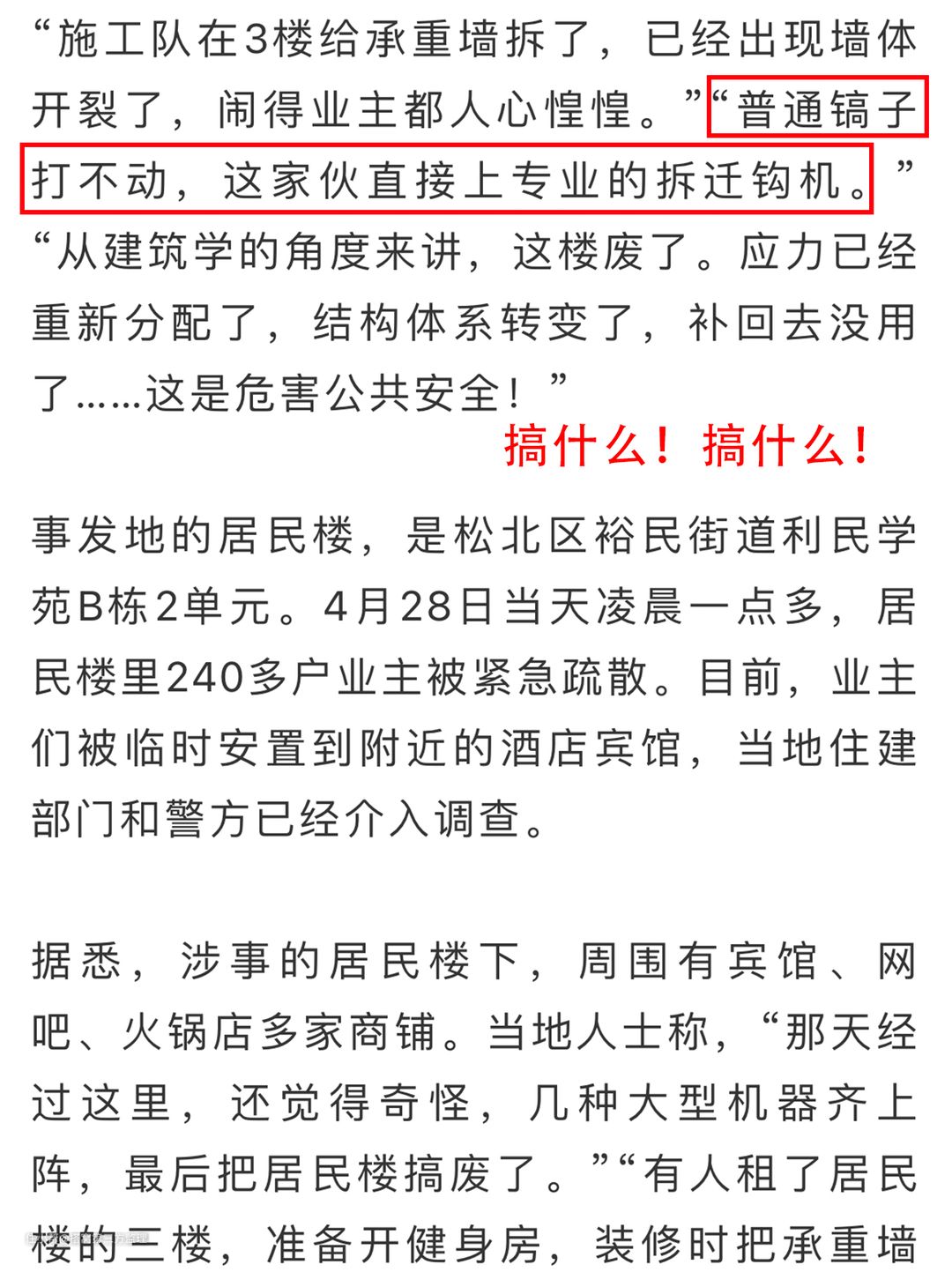 近日,哈尔滨市松北区某栋楼,三楼租户一健身房老板拆除了承重墙,造成小区整栋居民楼的住户被疏散。
