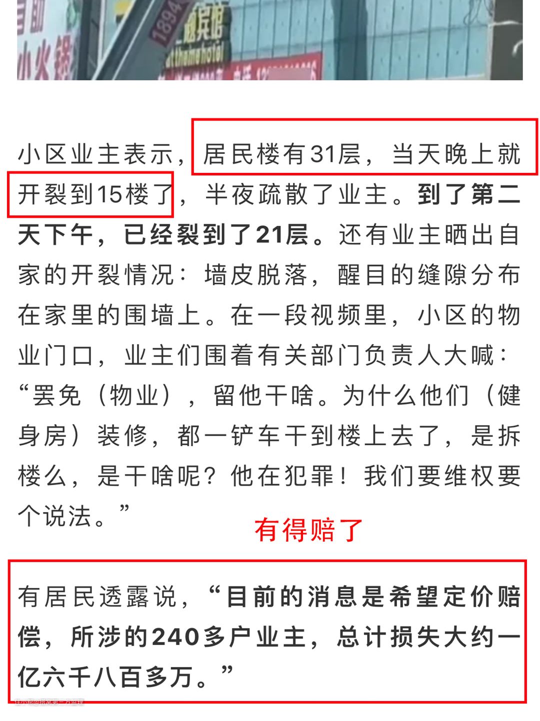 该居民楼一共31层,当天晚上就开裂到15楼了,到了第二天下午,已经裂到了21层。健身房老板拆承重墙的行为,导致200多户居民无家可归,目前预估损失达到1.6亿。