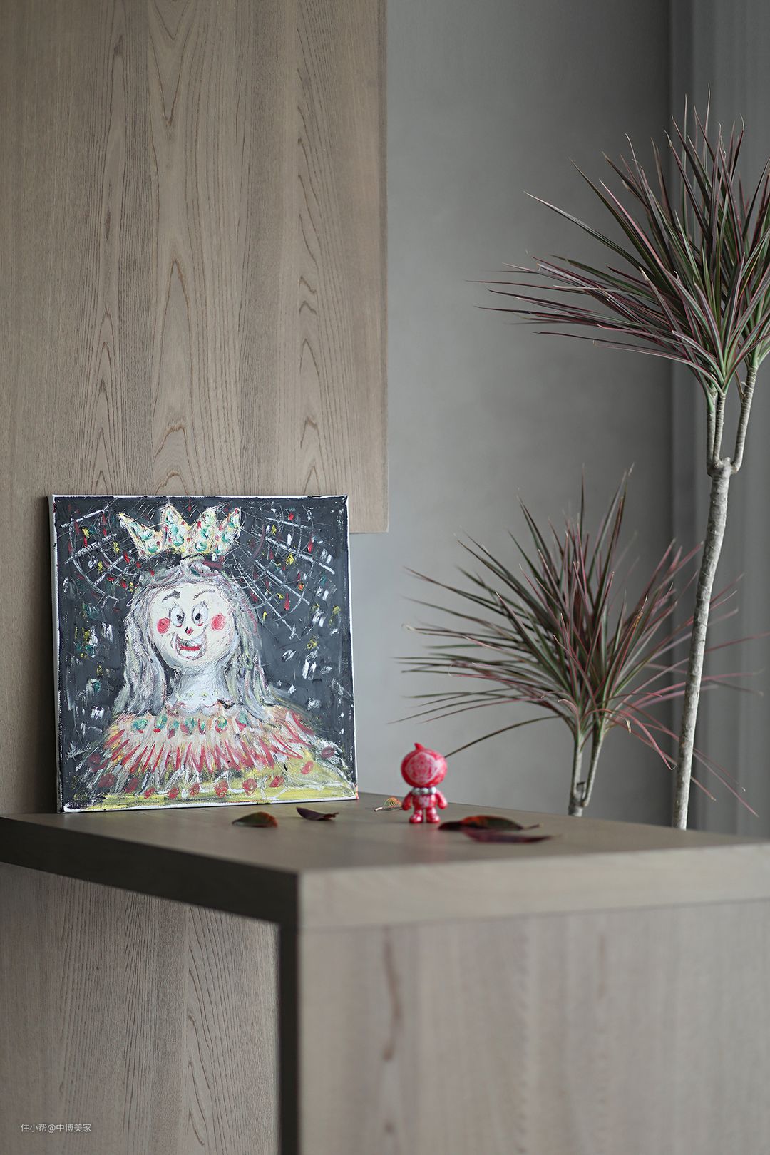阳台与客厅交接处利用原木吧台做隔断,摆上高脚椅,打造休闲娱乐之处;台面的艺术画品极具创意,尽显生活趣味感;角落的绿植彰显空间的自然感。