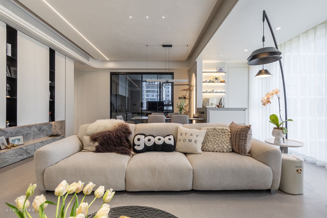 小小的角落,兼具了收纳、清洗和吧台的功能,吧台的右侧,延伸出一个小台面,可以当办公区来使用,刚好摆下电脑。设计师特意在柜子上,增加了一些开放式柜格,方便屋主收纳咖啡豆和咖啡杯,拿取时一目了然。