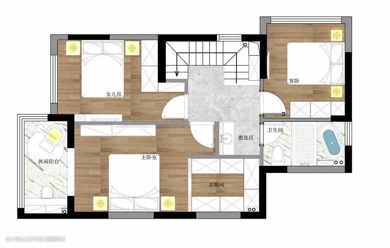 - 将楼梯空间扩宽,空间改为开放式,将外露台改为休闲阳台。