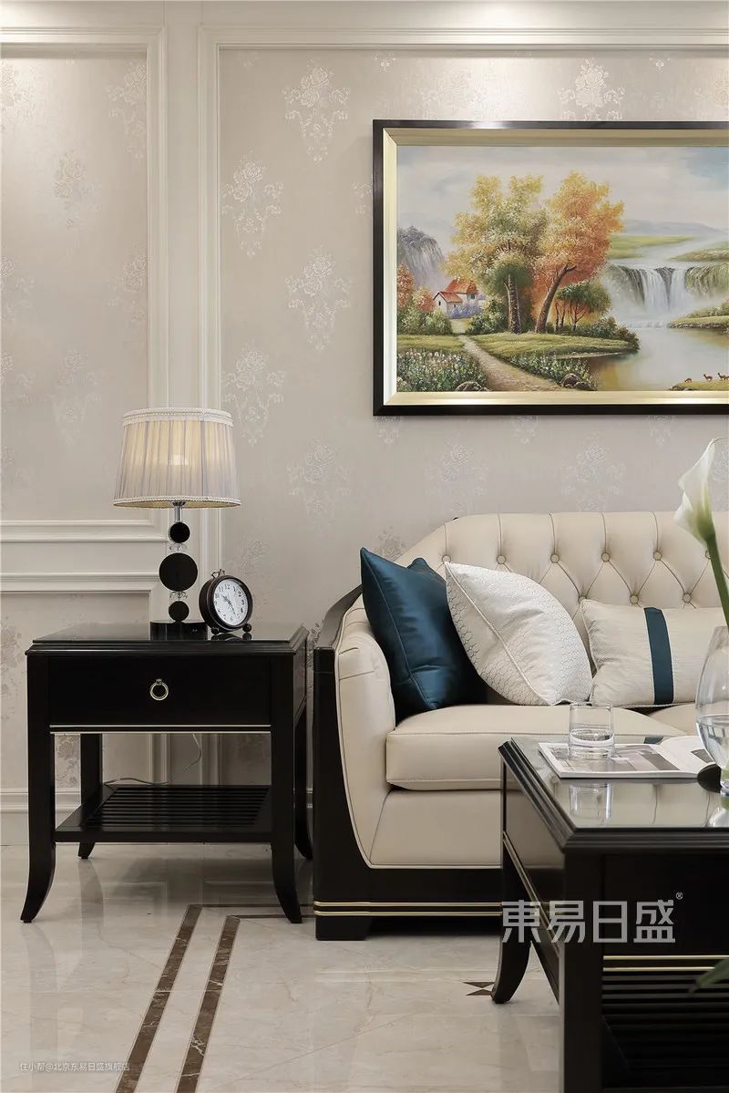 皮质的白色沙发讲究舒适,蓝色的绸缎抱枕作为亮点为空间点缀,主背景增加田间油画壁画与壁纸的组合,营造出复古美式与空间细腻质感。在主体家具的选型上,偏向现代风格,台灯与仿古钟表又有着中世纪的韵味。