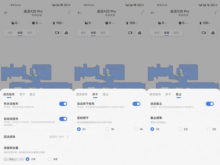 追觅X20pro:进入APP后主页面就有实时视频、开始清洁、开始回充等使用频率较高的功能。进入设备后可以选择智能托管模式(日常/极致)、自定义清洁。自定义可设置专属清洁方案,扫拖-纯扫/纯拖/扫拖/先扫后拖;吸力-安静/标准/强力/超强;拖地效果-节水/标准/深度,可热水洗拖布可常温水洗;对回洗频率、烘干时间和集尘次数也可自由设置。功能划分非常细,选项自由度很高。