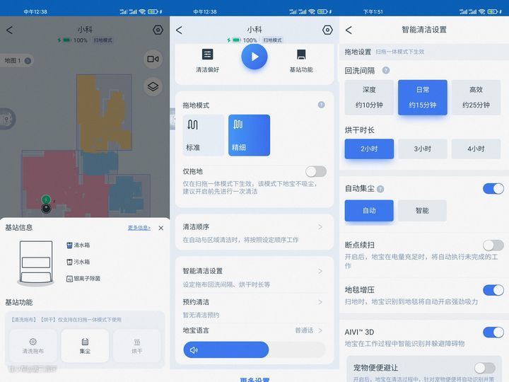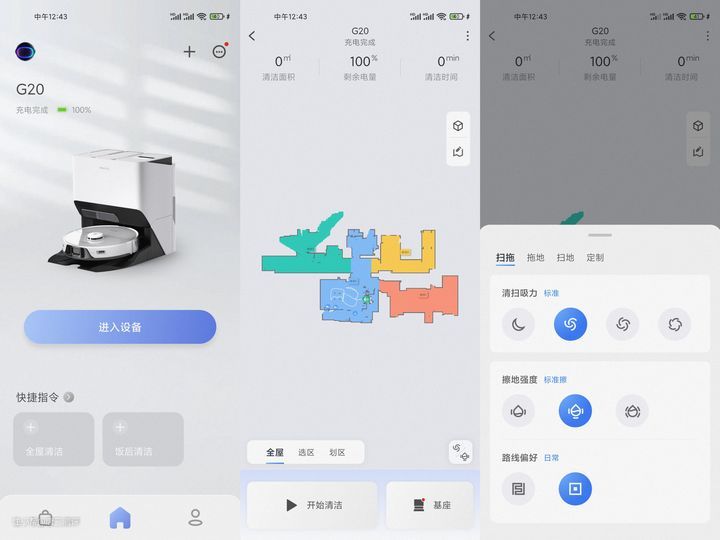 石头G20:点开APP进入设备后可对扫地机器人进行设置。扫拖/扫地/拖地,对于吸力大小、擦地强度、以及清扫路线等清洁细节都能自由控制,基站的集尘、洗布和烘干的次数也可以灵活设置。页面简洁便利,选项自由度还可以。