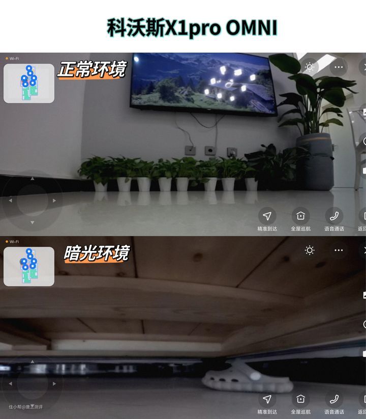 科沃斯X1pro OMNI:同样支持远程视频语音通话,不过不是双向通话,只能打开手机通过扫地机器人查看家里的情况。整体的画质比较暗,清晰度一般,也没有补光功能,在暗光环境下和追觅X20pro相比相差甚远!