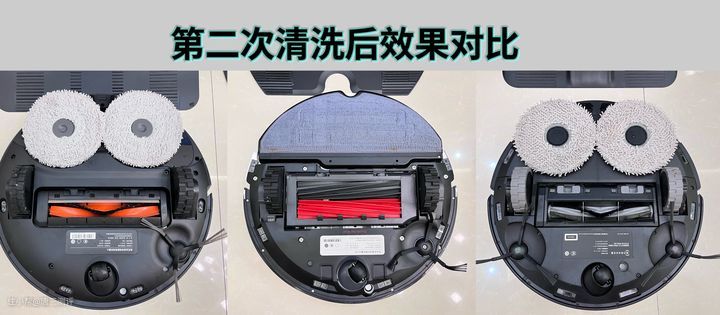 经过二次清洗,三款机型都算是很干净了。其中追觅X20pro清洁效果最为突出,因为58℃热水溶污效果比冷水好很多;其次是科沃斯X1pro OMNI,相比第一次清洗效果要好很多;石头G20第二次清洗效果明显不太理想,绒布连接处的缝隙存在清洗盲区,两次清洗都没有覆盖。