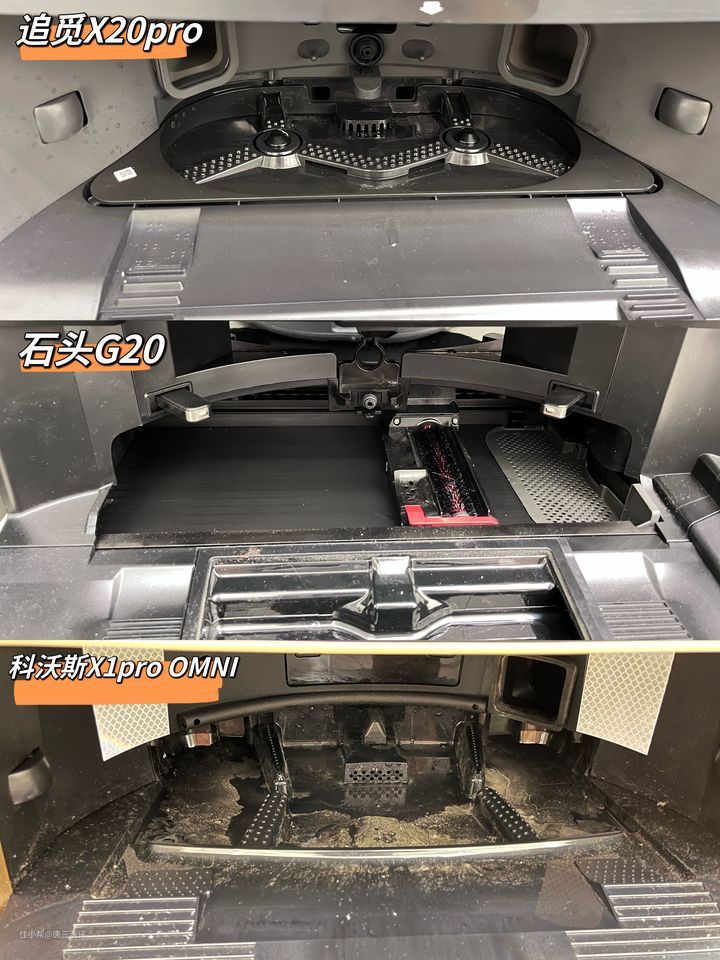 追觅X20pro和石头G20的基站还算干净,科沃斯X1pro OMNI的基站有些惨不忍睹。另外追觅X20pro支持底座拆卸,清洗时相对方便很多,不过石头底座设计比较特别,清洗拖布时会来回移动,所以说石头的底座不会太脏,而科沃斯底座就比较拉跨了,清洗时需要拿个小刷子弯腰清理。