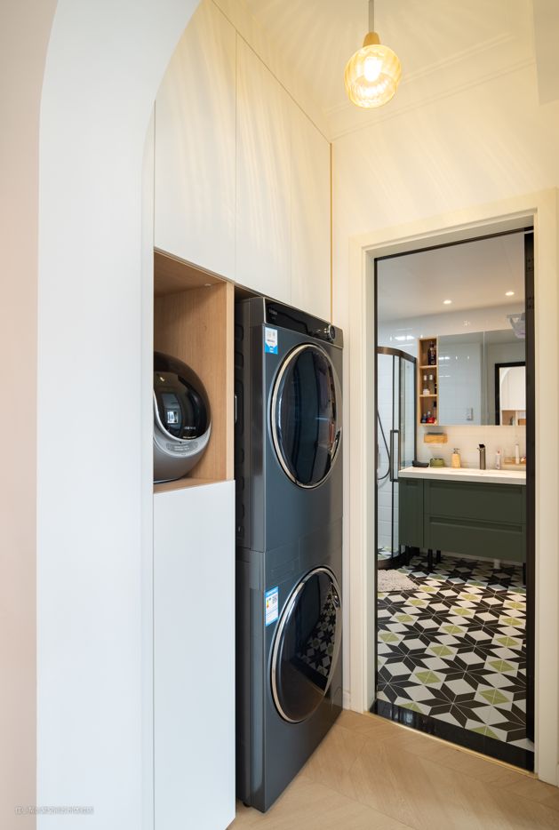 提前预留好洗衣机、烘干机尺寸,内嵌柜内,洗完澡就可以直接把脏衣服扔进去,动线合理,且释放了卫生间内部空间。
